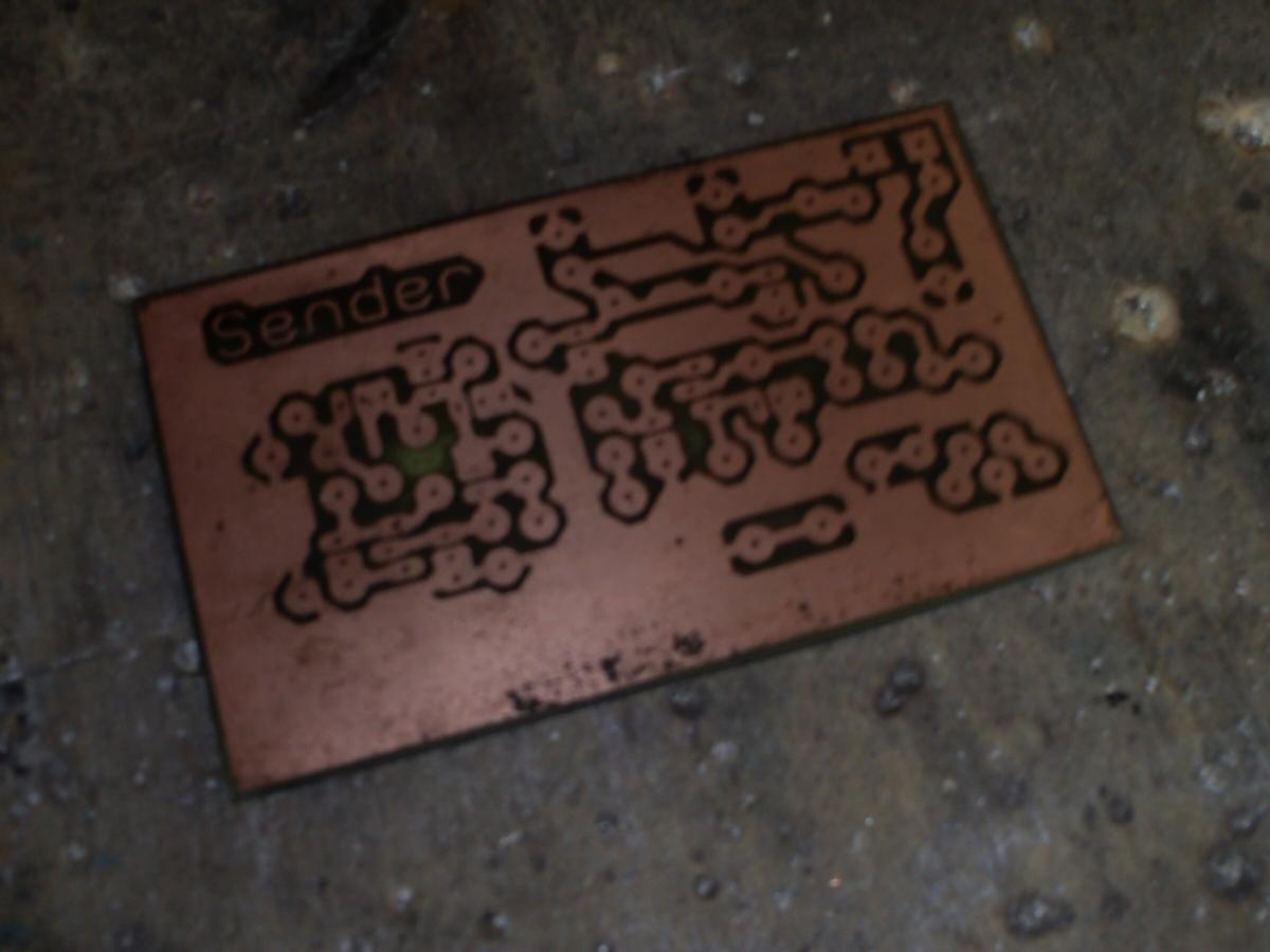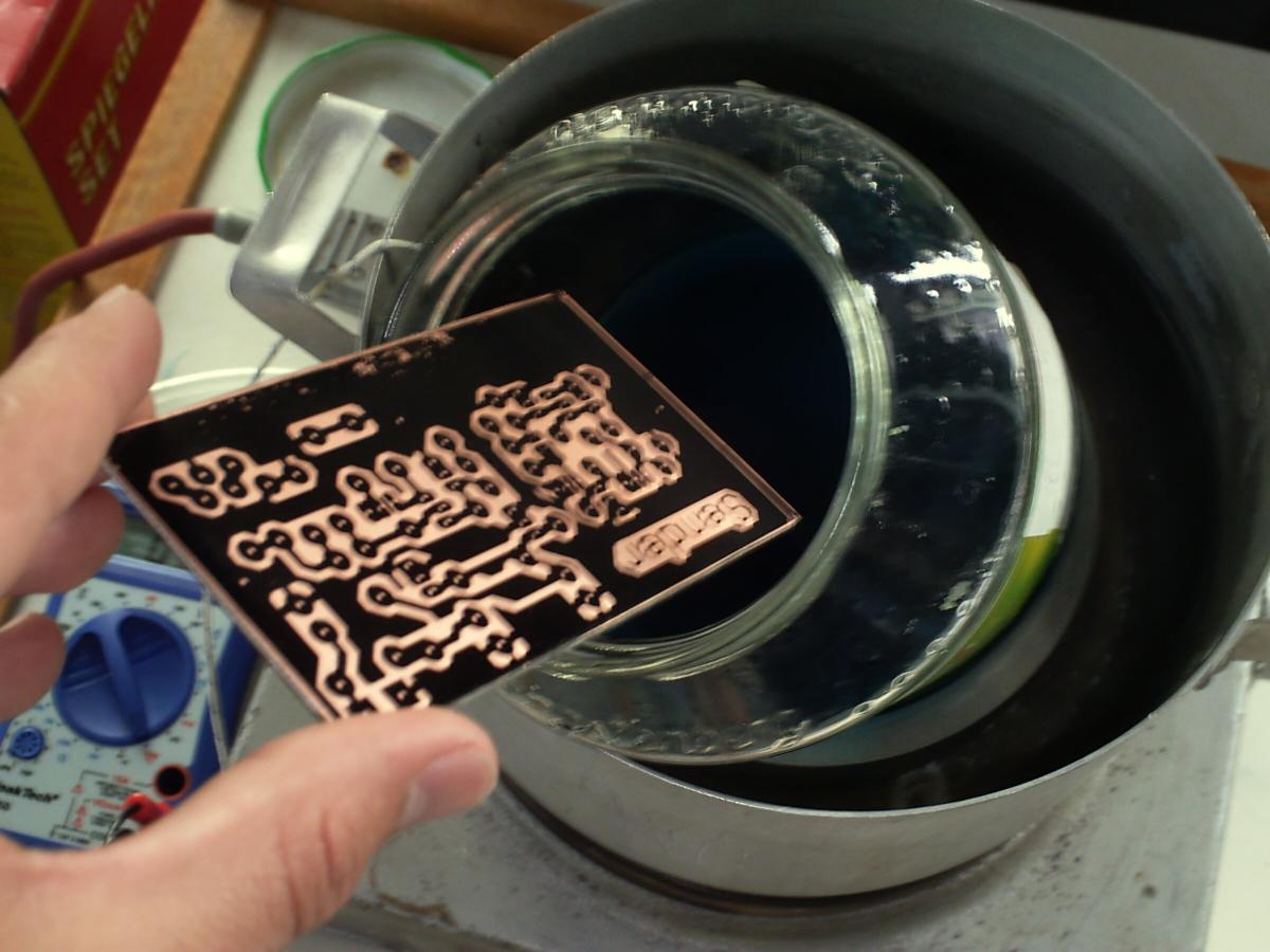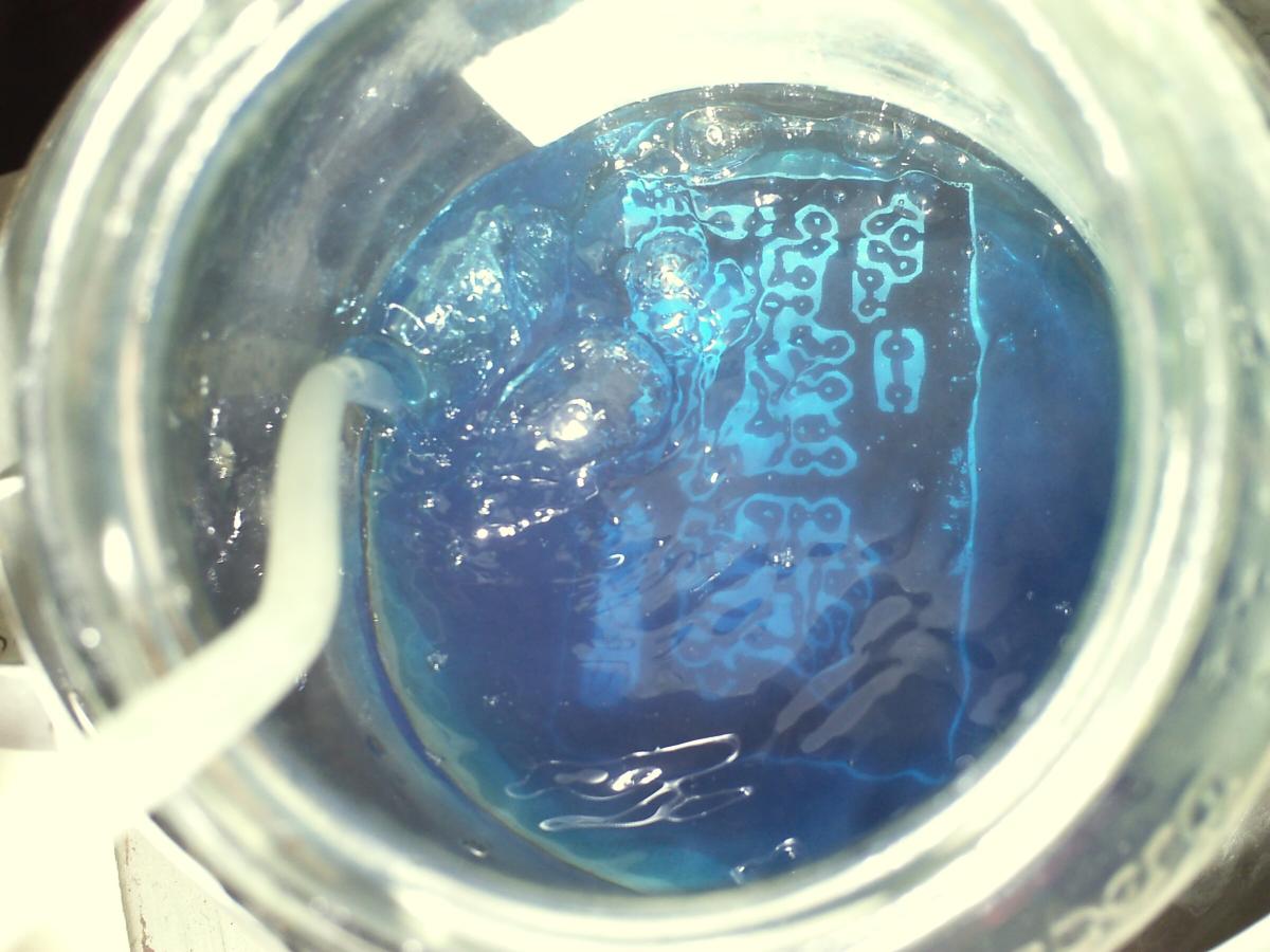 - Bedruckte Platine in 50°C warmes aufgelößtes Natriumpersulfat tauchen und so lange warten (und ggf. bewegen) bis sich das Kupfer überall da gelößt hat, wo kein Toner ist