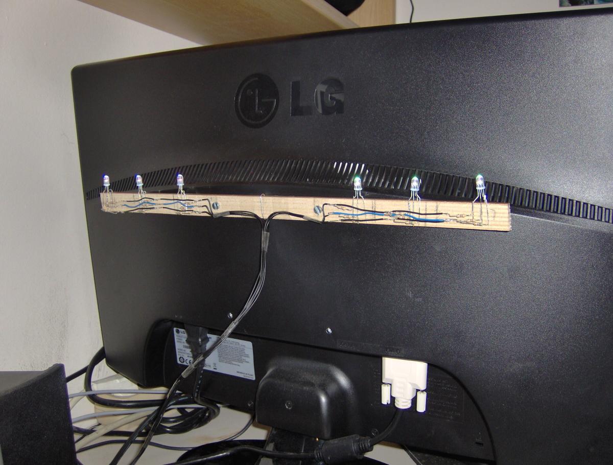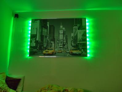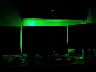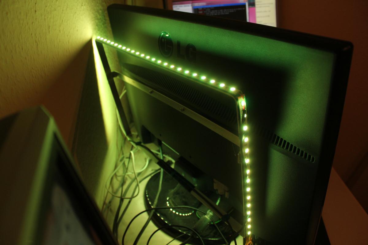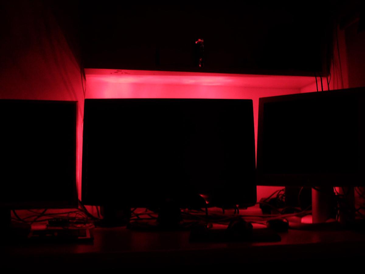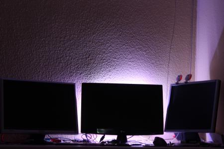 Jetzt sind alle 4 Kanäle hinterm Monitor befestigt und Beleuchten die Wand hinter ihm.