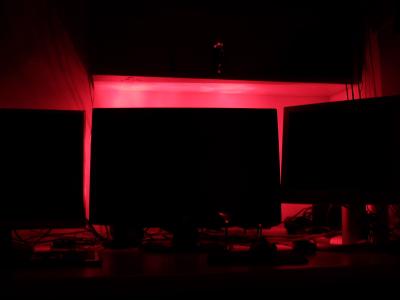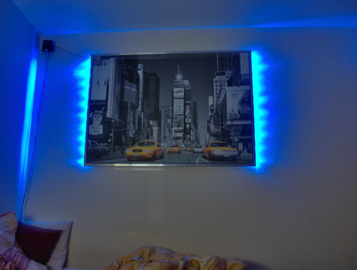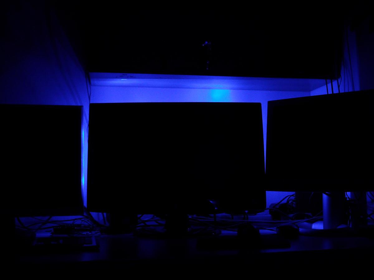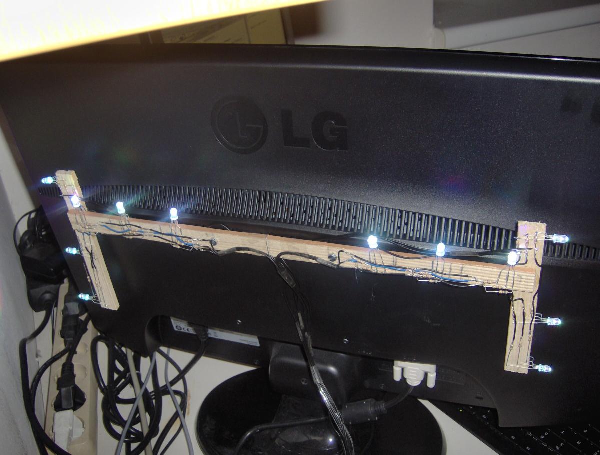 Jetzt sind alle 4 Kanäle hinterm Monitor befestigt und Beleuchten die Wand hinter ihm.