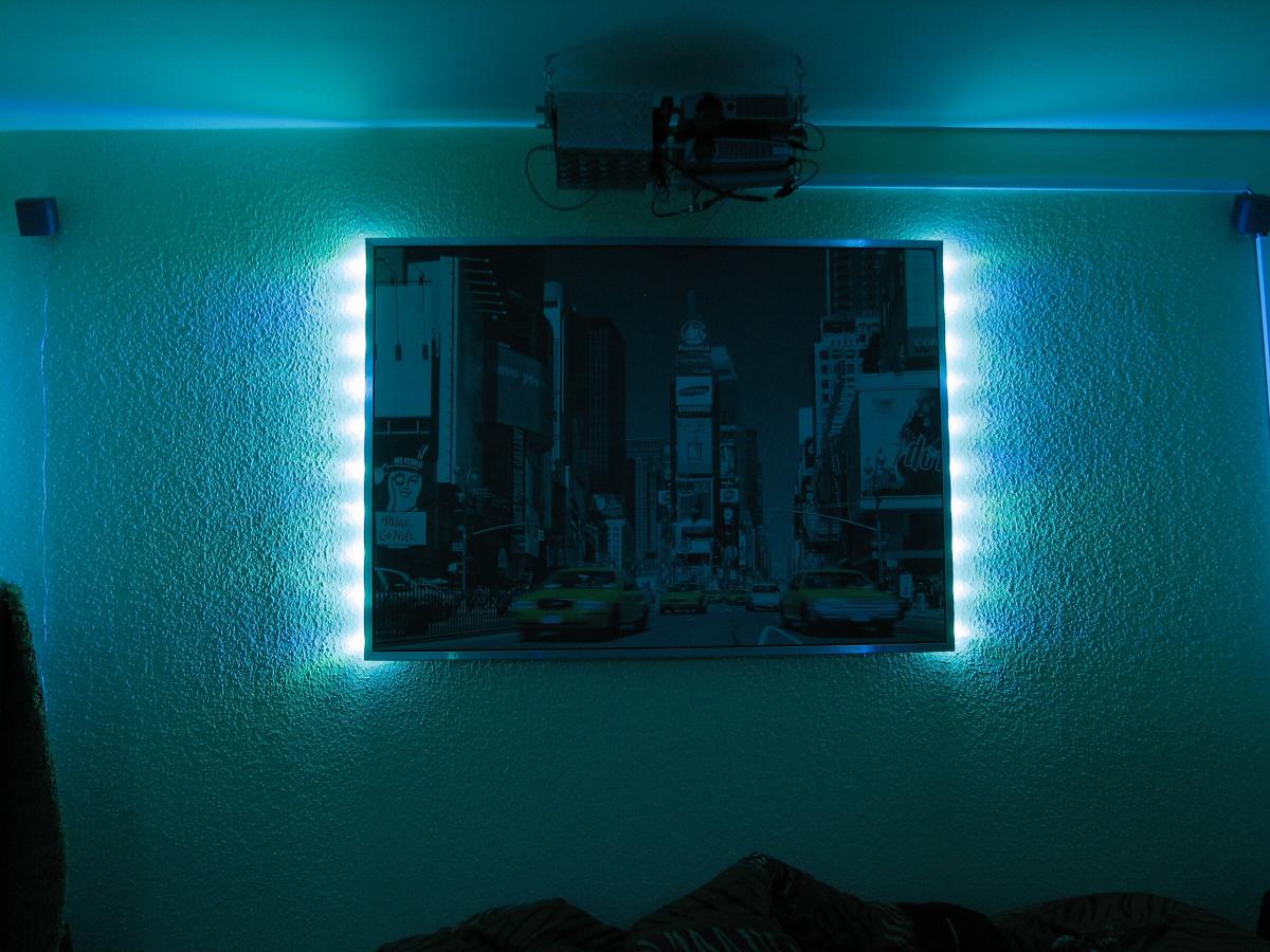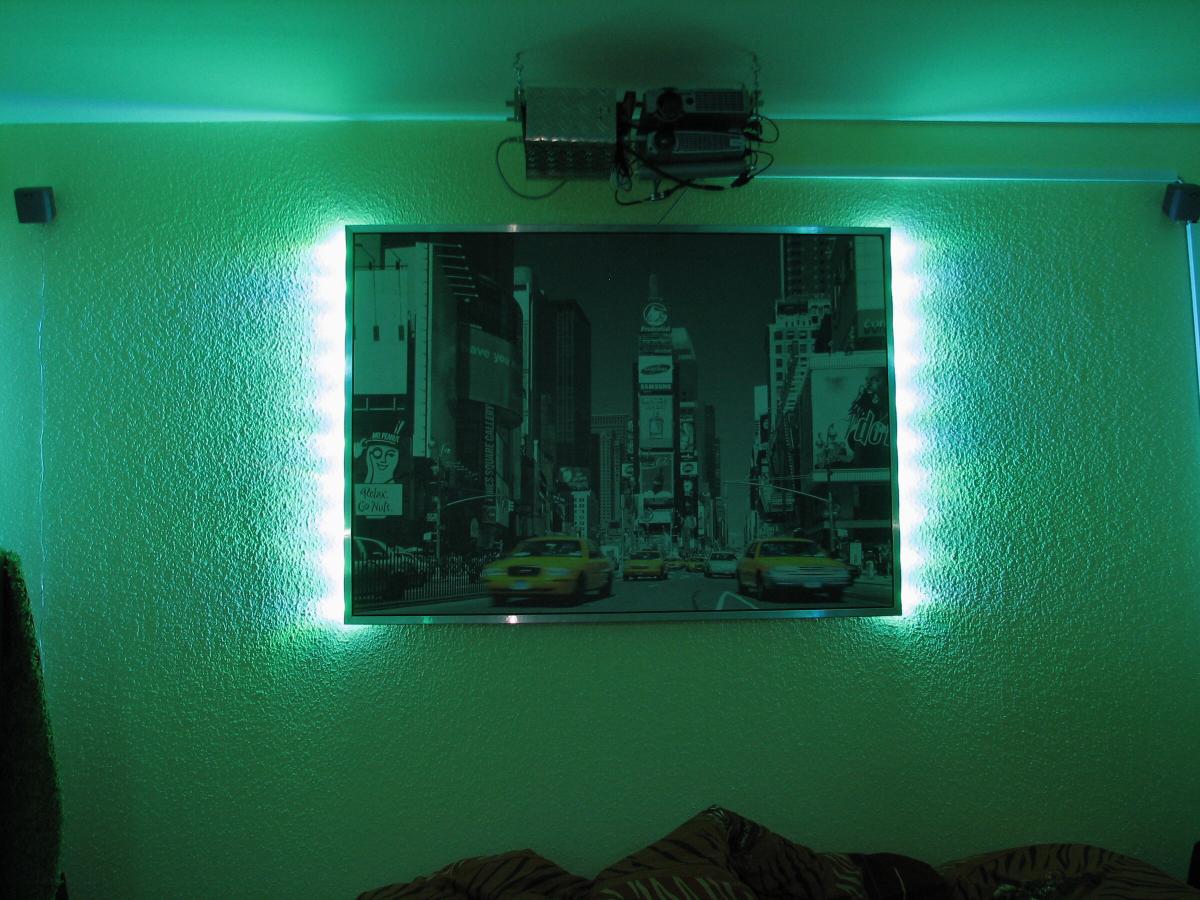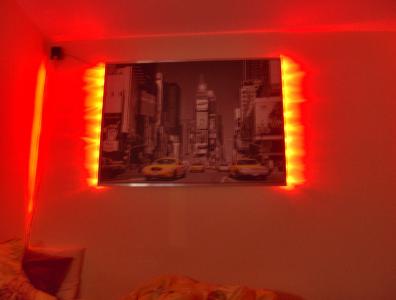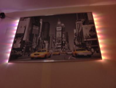Das Bild mit der LED-Beleuchtung hängt zzt. an einer rauen Wand, die das Licht noch etwas besser zur Geltung bringt