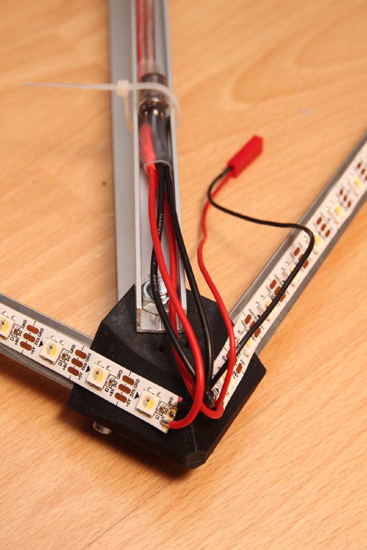 Als Lösung habe ich dazu einen Rahmen aus Aluminium T-Profilen gebaut, welcher mit an die Wandbefestigung montiert wird und frei zwischen TV und Wand hängen soll. Verbunden werden die T-Profile durch gedruckte Eckstücke. Für eine Ausleuchtung bis in die Ecken lassen sich die SK6812 LED Streifen bis über die Plastikecken kleben. An zwei der vier Verbindungspunkte wird die Spannung eingespeist inkl. 1000µF 16V Kondensator.