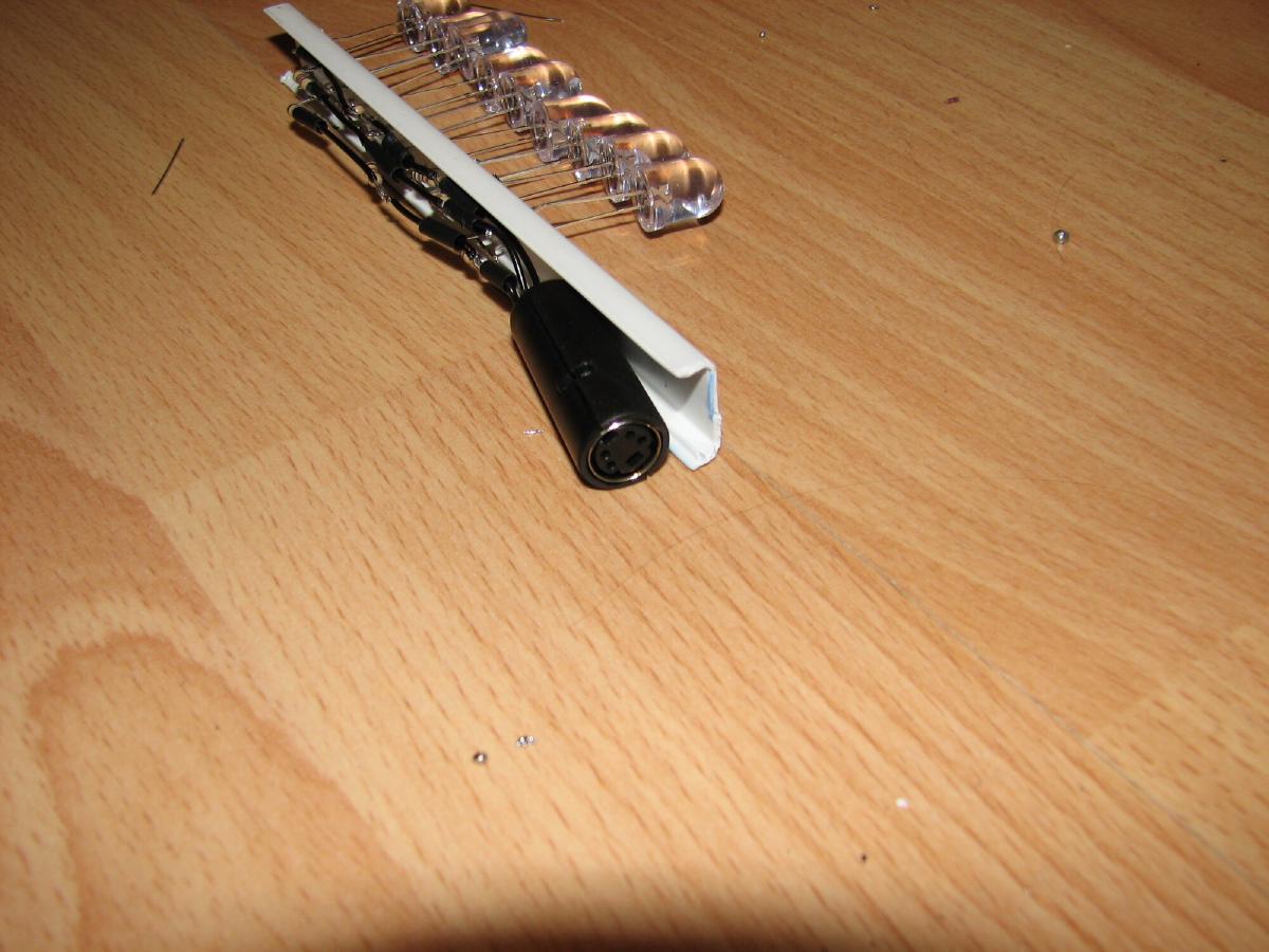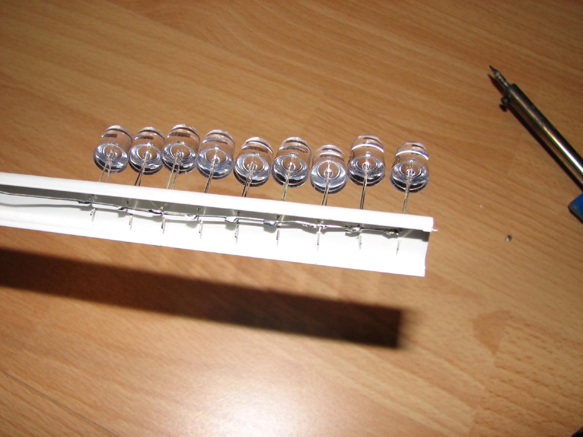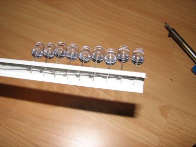 Die 9 Leds kommen in einer Reihe in einen zweckentfremdeten Rohrkanal und werden auf der Rückseite verlötet