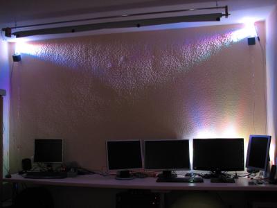 Die Wand, welche von den Ecken aus jeweils mit einem Strahler beleuchtet wird, ist die an welcher der Monitor steht.