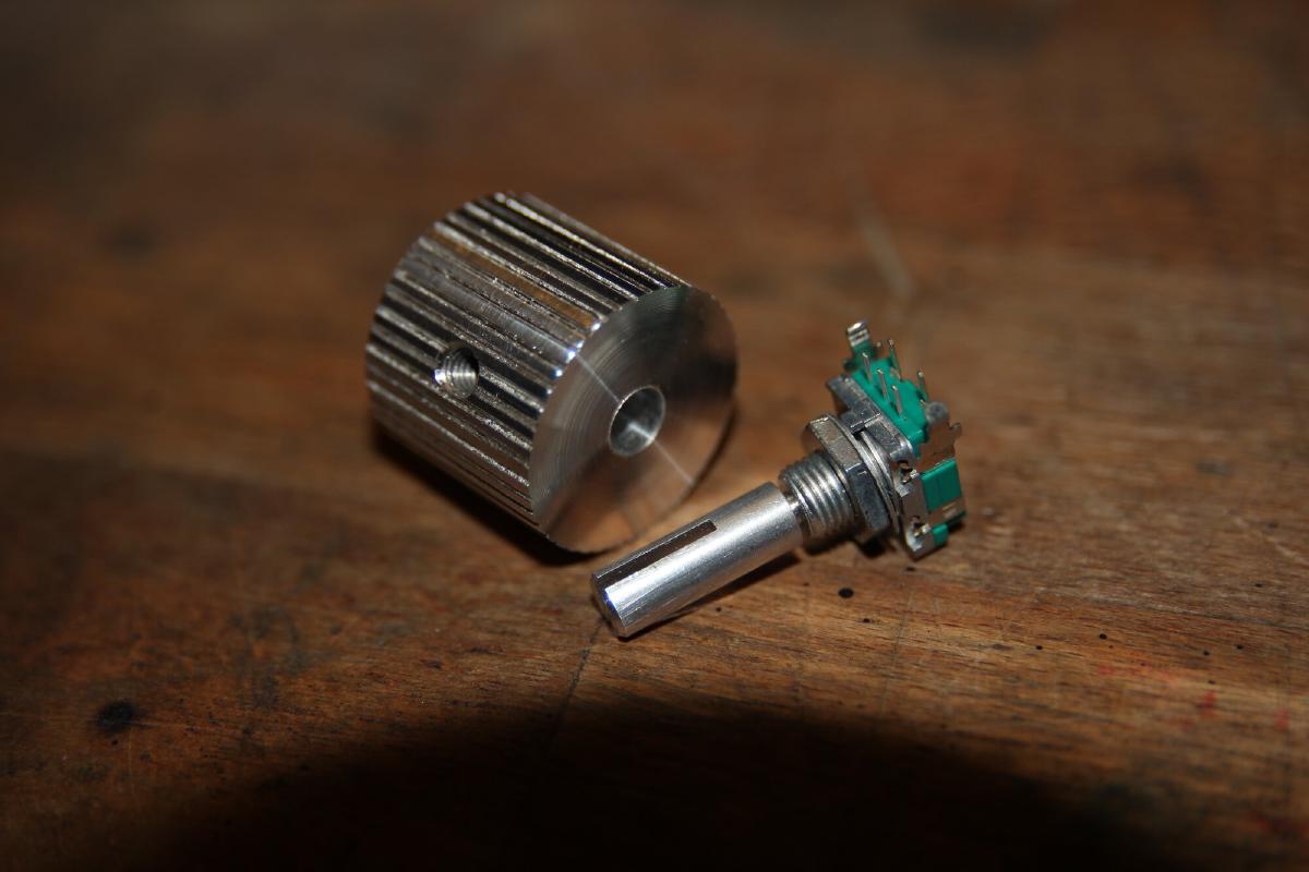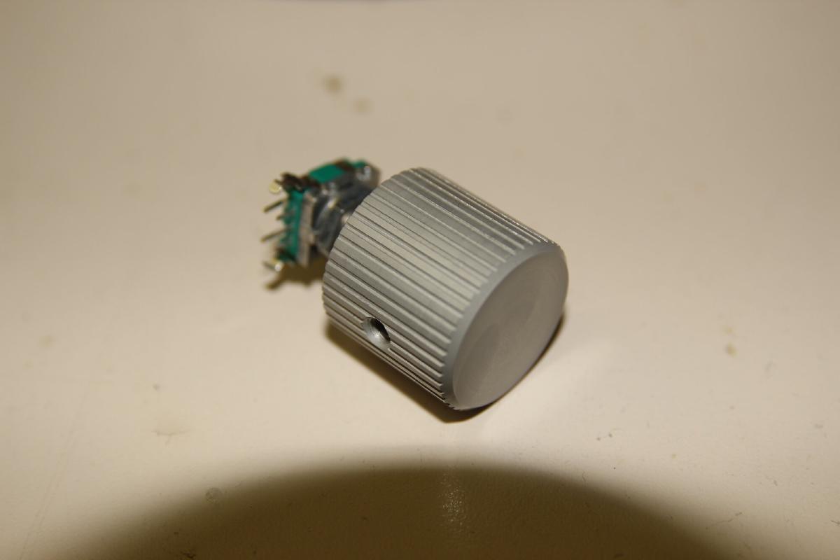 Lautstärkeregler und Eingabemöglichkeit bildet ein Encoder mit Drucktaster. Den Drehknopf habe ich gedreht/gefräst und anschließend eloxiert.