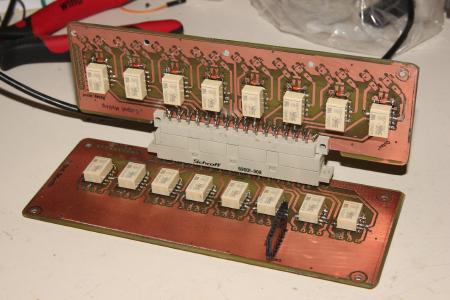 Unter der “Main Volume” Platine befindet sich die Kanalauswahl “Output Selector”. Jedem der acht Stereoausgänge können zwei Gruppen zugewiesen werden. Hierzu wird ein Kabel angelötet von z.B. “5A NC” (Ausgang 5 Links Normally Closed) auf eine der horizontalen Leiterbahnen 1-8, welche mit den Gruppen verbunden sind. Damit wäre es möglich in einem Surround Lautsprechersetup die hinteren Boxen auf den Front-Kanal zu legen. NC (Normally Closed) und NO (Normally Open) bezeichnen hierbei die Kontakte der NEC-EB2-12NU Relais. Diese wurden ebenfalls zum Stummschalten der Ausgänge auf der nachfolgenden Platine verwendet.