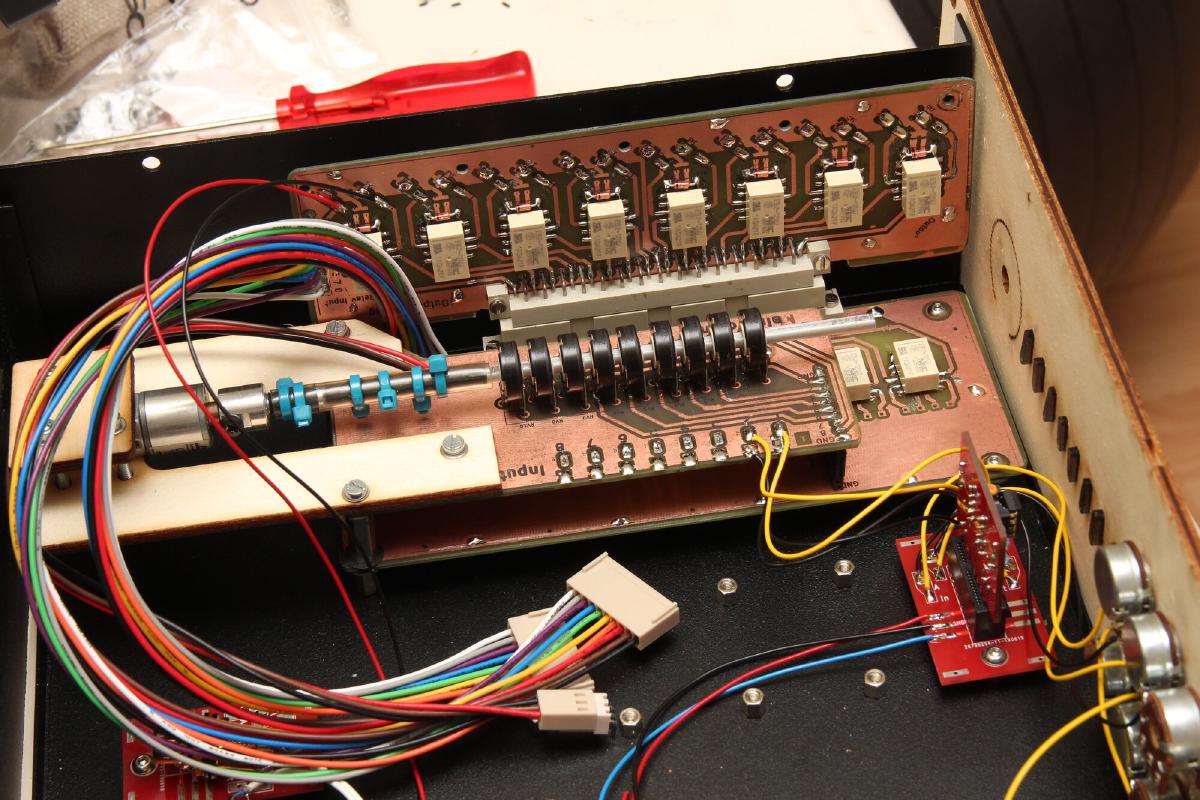Mit ein paar dieser Opamp-boards konnte ich endlich alle Stufen des Mixers testen. Und in diesem Zustand befand sich das Projekt eine ganze Weile. Nicht weil ich keine Lust hatte, sondern weil es so bereits in meine Soundinstallation integriert war. Immerhin konnte ich auf diese Weise im Betrieb die Firmware für den Controller auf Atmega328 Basis schreiben.