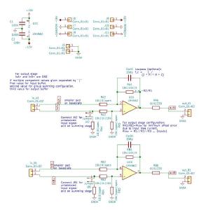 Wie eben erwähnt waren die kleinen roten Platinen nicht so dufte mit der PCI-Express Steckerlösung. Daher ein Redesign, bei dem nur der Opamp gesteckt wird. Die drei Konfigurationen Inputbuffer “In”, Summierer “Sum” und Outputbuffer “Out” werden durch die Wahl der Komponenten umgesetzt. Der größte Unterschied ist hierbei in der Art der Signalreferenz zu finden. Während der Mixer intern das Signal relativ zu GND der +-15V Spannung sieht kann das Audiosignal von außen symmetrisch anliegen, wobei der invertierende Eingang des Opamps nicht mehr GND entspricht. Dies lässt sich beispielsweise durch einlöten eines Widerstandes festlegen.