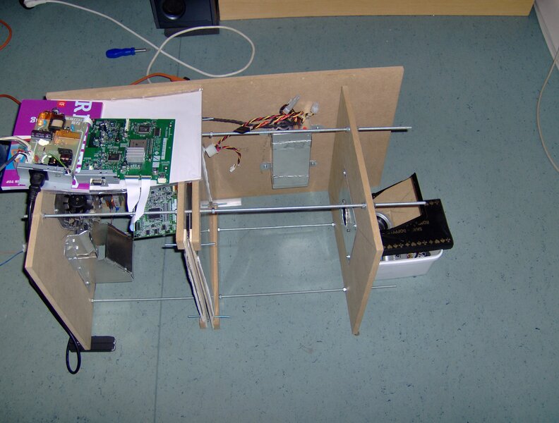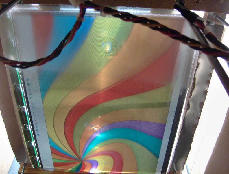 Nachdem ich das TFT Zerlegt hab musste ich noch prüfen, ob es auch noch funktioniert. Da es prima funktionierte hab ich es auch gleich mal provisorisch zwischen die Fresnels gelegt und alles irgendwie an die Steckdose geklemmt. Die Resultate wahren mehr als zufriedenstellend.