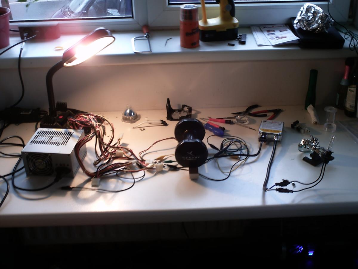 Als erstes hieß es natürlich Testen. Also PC Netzteil mit 10A auf 12V am EVG angeschloßen und mit genügend Respekt vor den 23000 Volt gezündet.