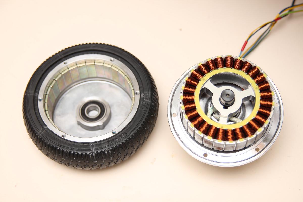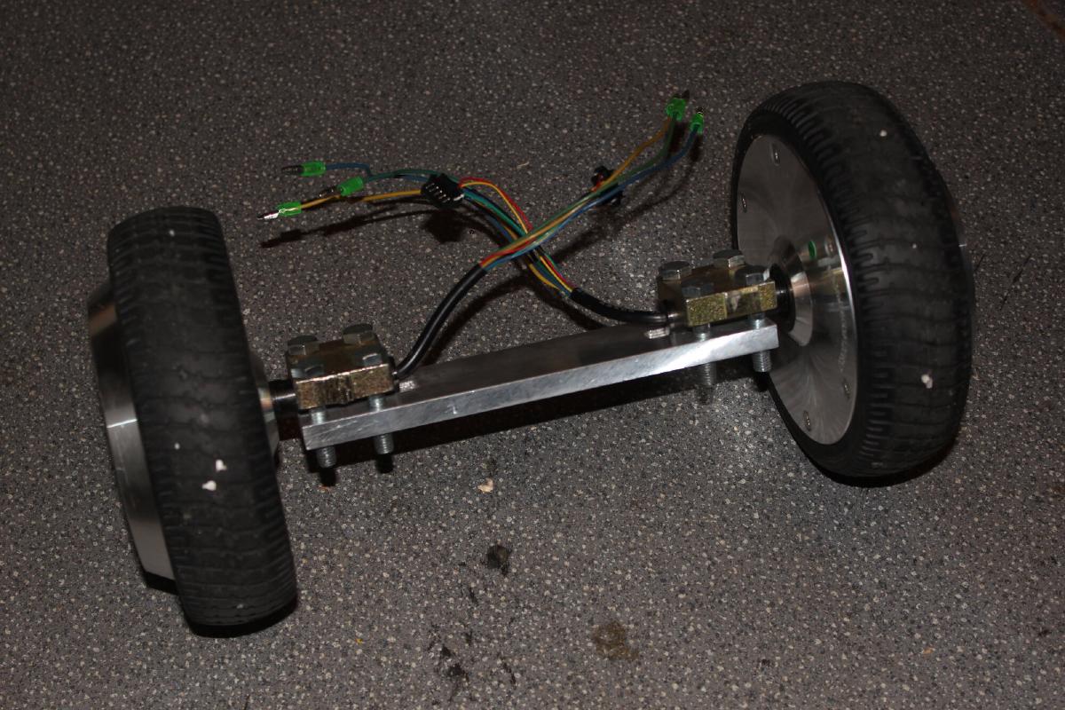 Kurzer Exkurs, für die jenigen, die son Teil noch nicht von innen gesehn haben: Außen befinden sich die Reifen. Der Motor ist ein Brushless Außenläfter. Motorkabel und die der Hallsensoren sind durch die Welle herausgeführt. Die Welle hat eine Kerbe und wird durch eine Metallplatte mit vier Gewindeschrauben am Gußaluminium festgeschraubt. Auf der im Bild rechten Seite befindet sich das Mainboard, welches einen STM32F103 verwendet, um zwei Brushless Controller zu implementieren. An der gleichen Stelle auf der anderen Seite sitzt der 10S2P LiIon Akku mit eingebautem BMS. Die beiden gleichartigen Platinen neben den Motoren steuern das Hoverboard durch je eine IMU, jede Seite balanciert sich demnach unabhängig voneinander. Die Laderegelung (CC/CV) befindet sich nicht im Hoverboard sondern in den beiliegenden Netzteilen. Besteigt man das Hoverboard werden auf jeder Seite mindestens einer der Gumminippel eingedrückt, wodurch eine Lichtschranke das Board aktiviert. Ganz einfach also.