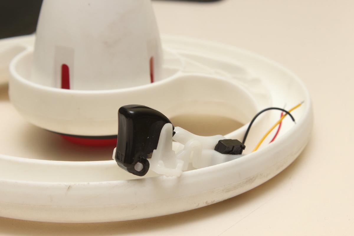 Zudem musste ich zur Filterung einen 2.2µF Kondensator zwischen Masse und Signal löten, da das Signal so verrrauscht war, dass das Bobbycar ruckartig von selbst losfahren wollte. Ein 100nF Kondensator zwischen GND und 3.3V kurz vor dem Hallsensor half auch etwas, die Versorgungsspannung zu glätten. Beides nicht die Musterlösung, tut aber. Die kleine Platine konnte dann mit den Kabeln unter der Hupe verstaut werden.