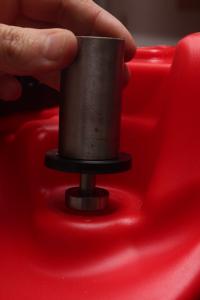 Auf der Plastikscheibe (42mm Durchmesser, 5mm Dicke) sitzt ein Edelstahlrohr. In dem Rohr ist eine 8mm Stange eingesetzt, welche durch genannte Plastikschreibe und einen weiteren Zylinder mit Loch im Inneren mittig gehalten wird. Durch eine Feder um die Stange wird das Kugellager in seinen Platz gedrückt.