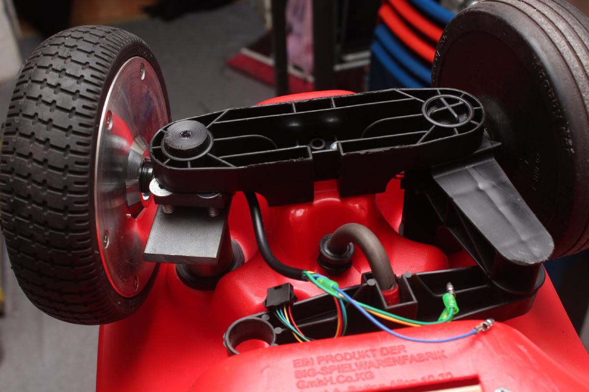 Auf der Teststrecke unserer Chaos West Assembly konnte ich das Bobby Car sehr gut testen und stellte dort auch fest, dass die Vorderräder auf dem glatten Hallenboden der Messe Leipzig nicht gut halten und das Lenken bei mehr als 10km/h nicht möglich ist. Auch die originalen Gleitlager der Vorderräder wurden nach nur wenigen Minuten Fahrzeit sehr heiß.