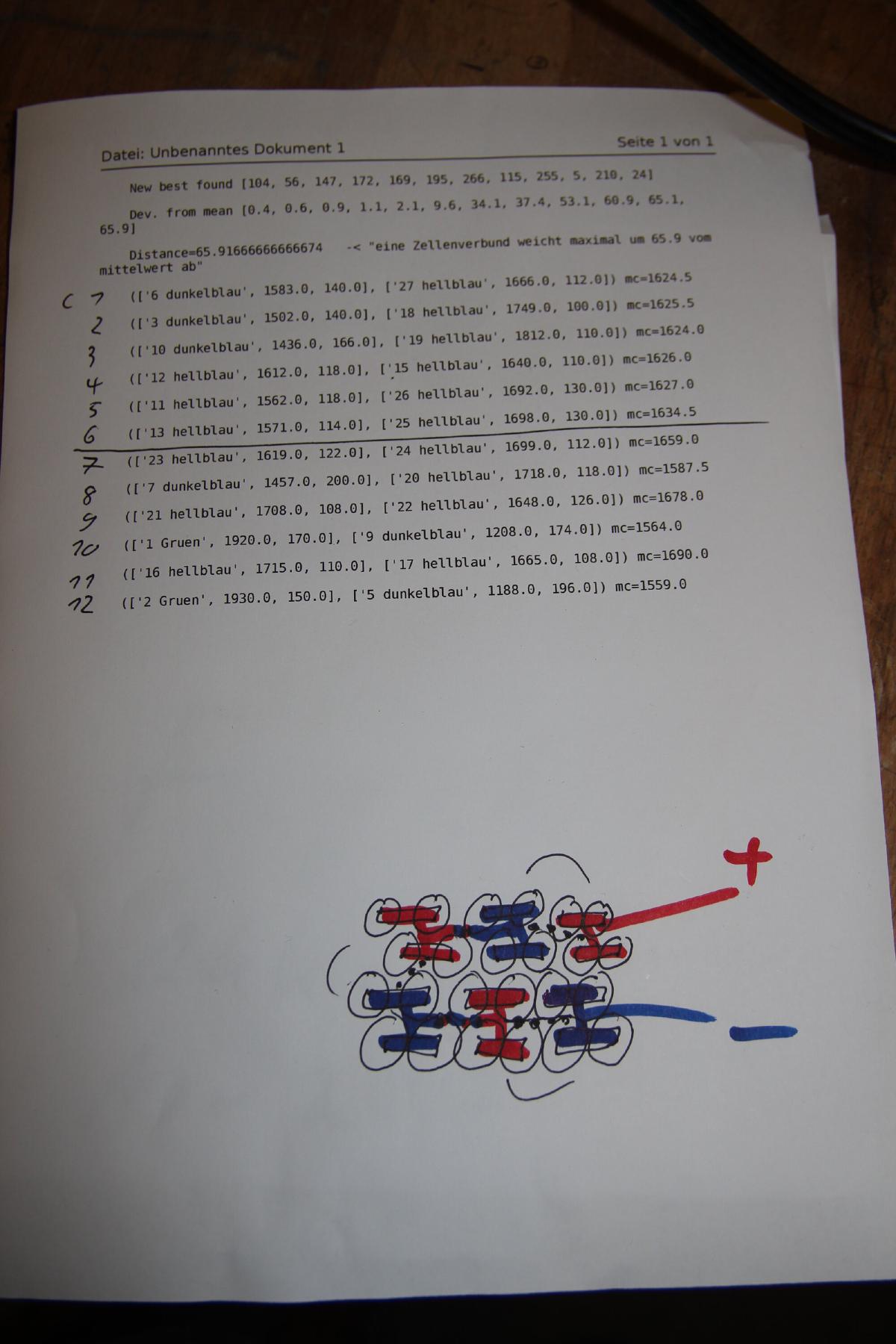 Drei der 27 2P Akkus hatten einen sichtlich höheren Innenwiderstand. Mit den verbleibenden 24 Doppelzellen konnte ich dann das 12S Paket planen.