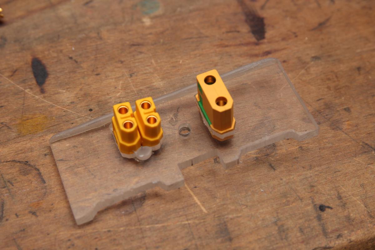 Irgendetwas, um die Akkus einerseits getrennt voneinander zu laden und auch die Stromversorung komplett zu unterbrechen, wollte ich noch anbringen. Dazu bekam die gerade erwähnte dicke Acrylglasplatte ein paar ausfräsungen für zwei XT60 und eine XT90 Antisparkt Buchse.