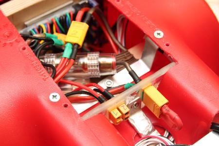 Die beiden XT60 sind direkt mit den Akkus verbunden. Der XT90 Antisprak, an welchen ein Stecker als Brücke kommt, verbindet beide 6S Akkus in Reihe. Dazu noch eine AGU Sicherung und alles ist tip top. Bisher hatte ich einen Peak von 40A messen können, daher sollte eine 40A Sicherung erstmal reichen.