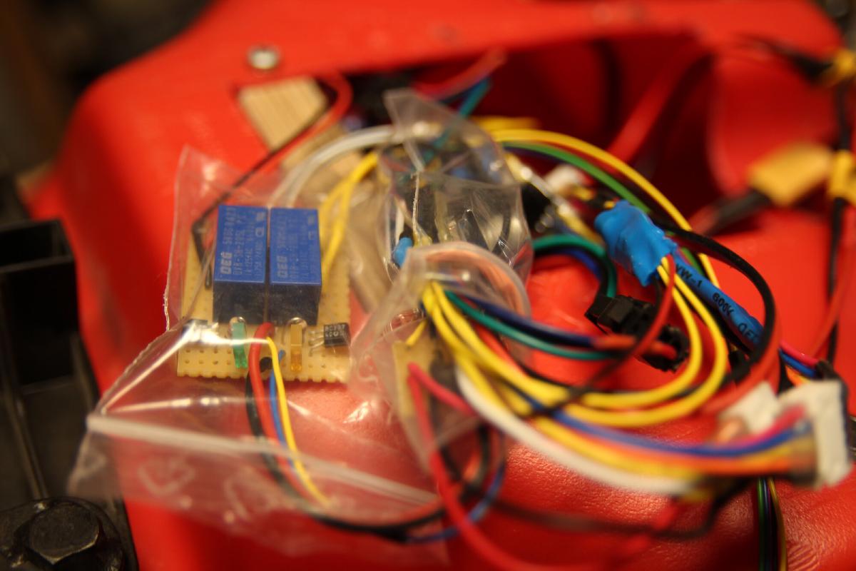 Der controller wird durch den neuen “Engine Start” Knopf hinter der Lenkstange eingeschaltet. Erneutes Drücken aktiviert zwei Relais, welche die Powerschalter der beiden Hoverboards simulieren. Das lässt sich vermutlich deutlich eleganter umsetzen, jedoch schien das mir der Problemfreieste Weg. Und es klickert ganz toll :) Die ursprünglichen Taster sind weiterhin parallel dazu angeschlossen für den Fehlerfall.