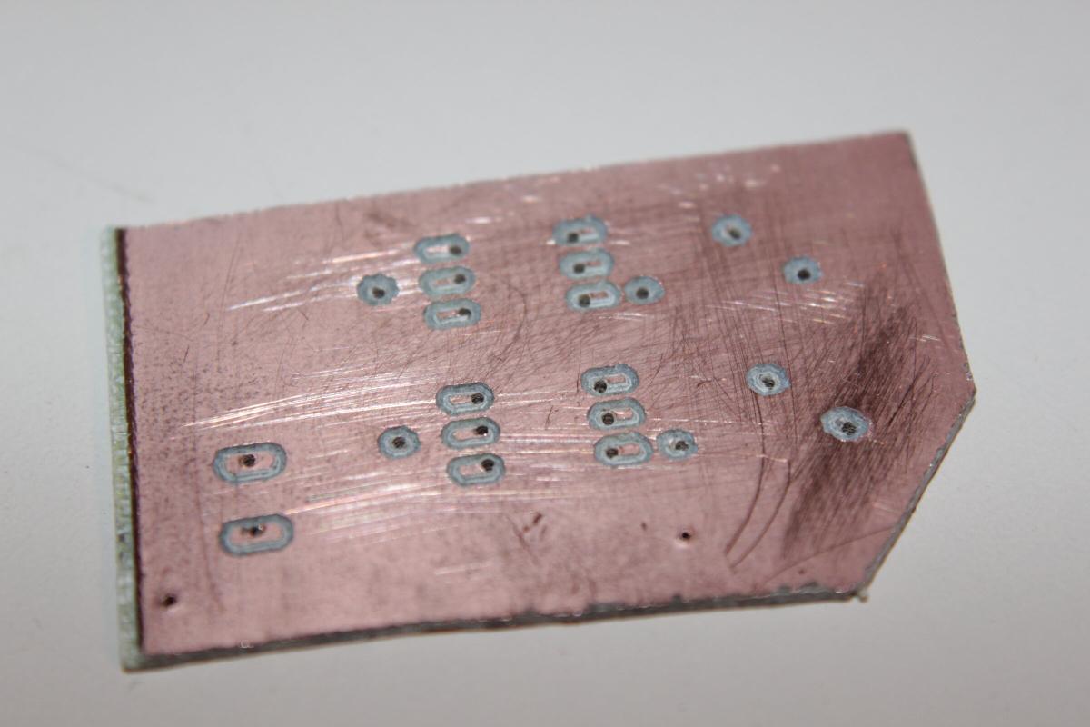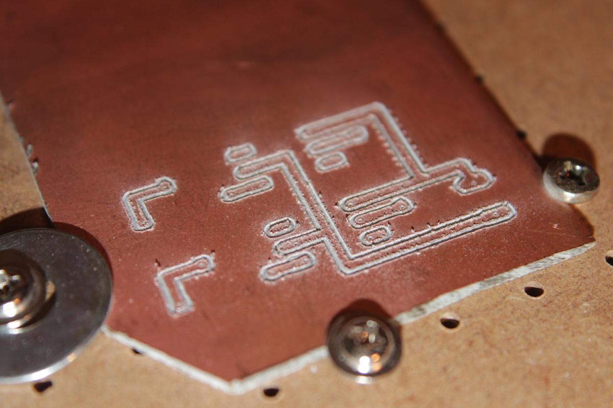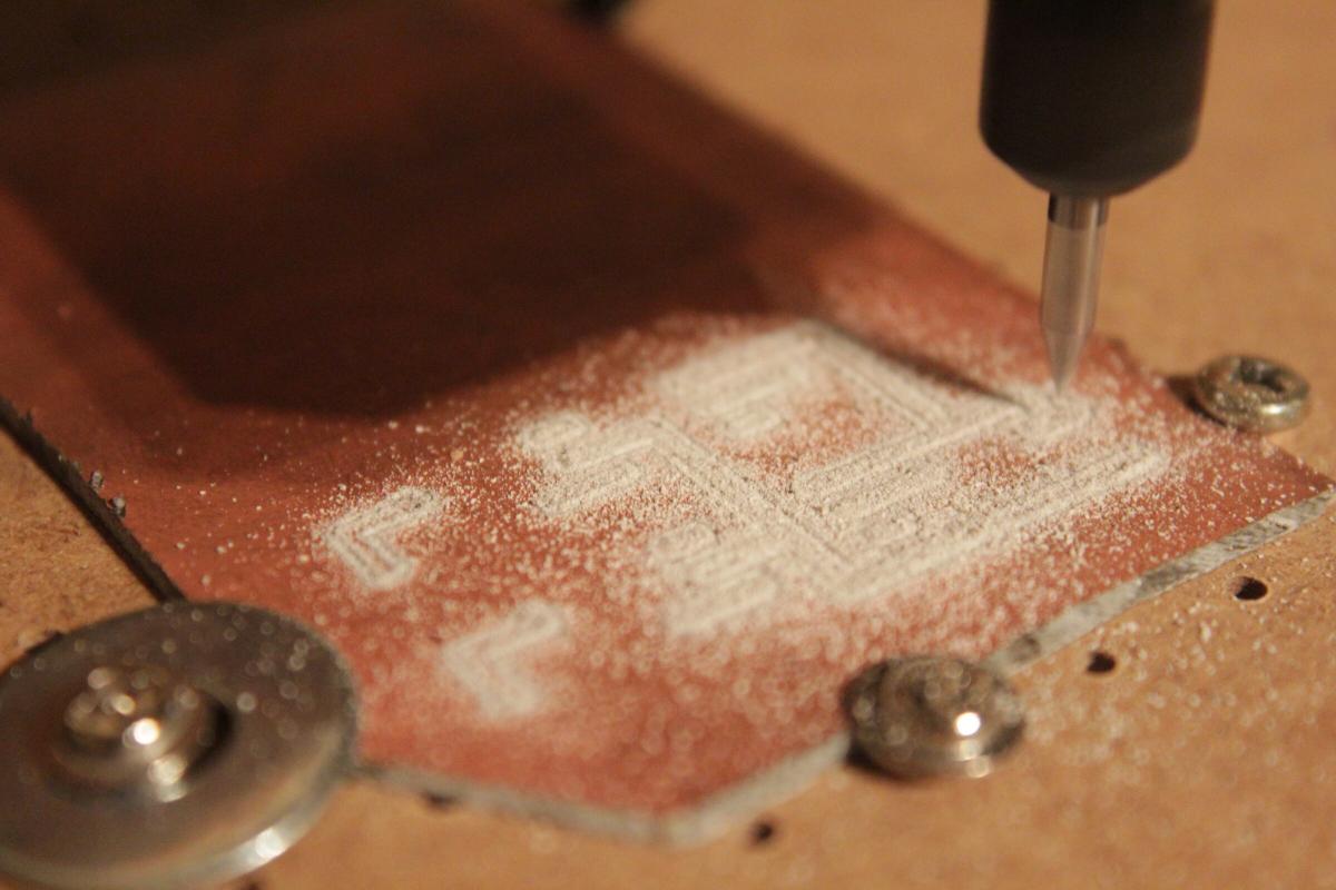 Dabei wird das Kupfer um die Leiterbahnen herum mit einem Gravierstichel weggefräst.