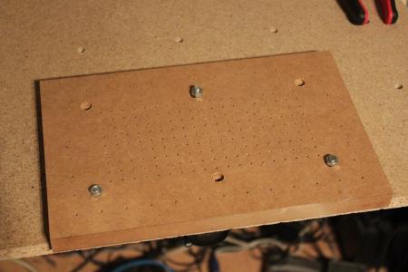 Somit kann die Platine durch verschiebbare Plättchen auf eine Lochgerasterte MDF Platte geklemmt werden.