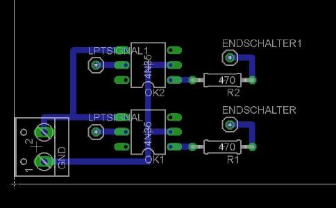 Als Beispiel hier das Board zur Mini-Optokopplerplatine für die Endschalter, welches ich in die Steuerbox eingebaut hab.