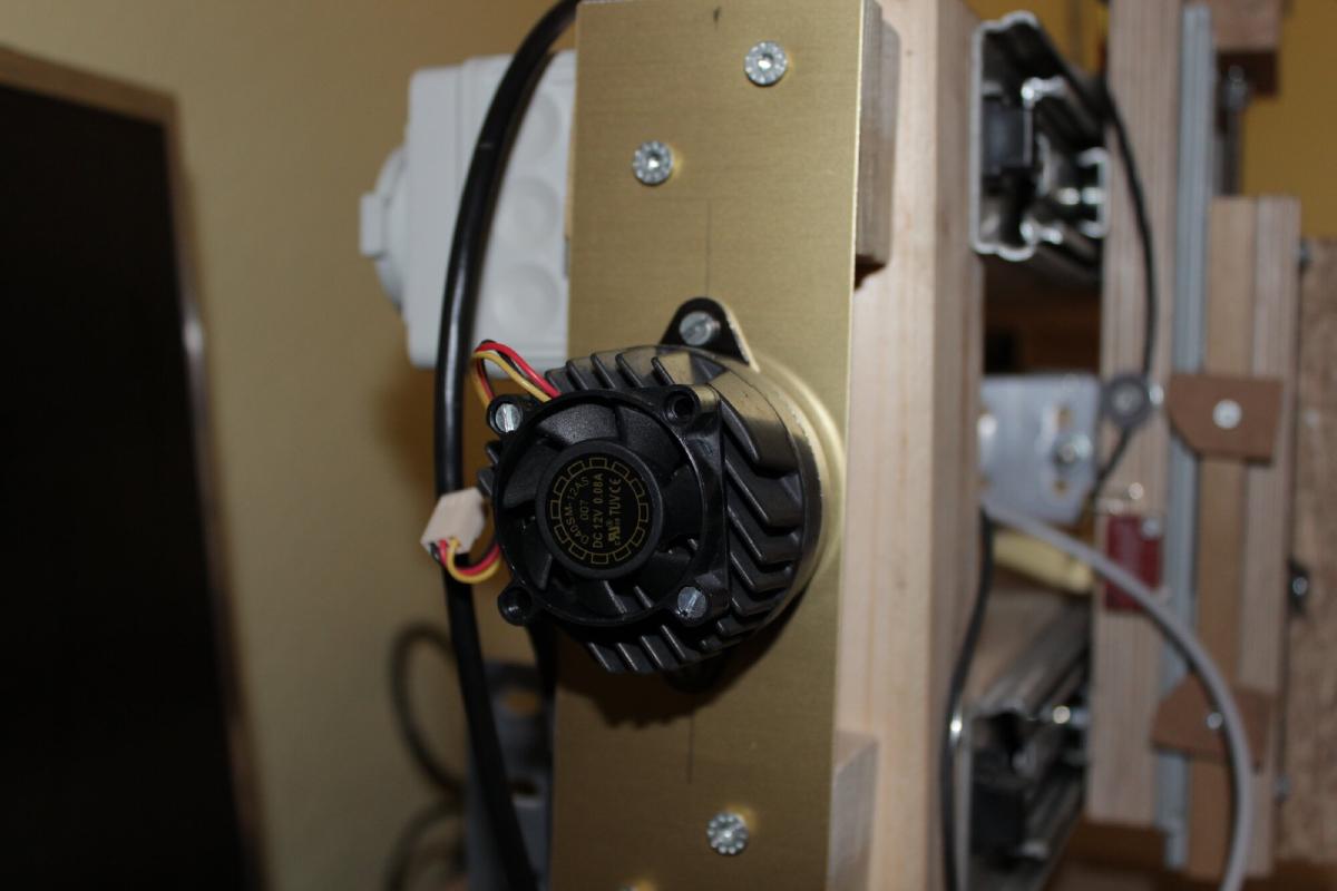 Ab ca. 10 Minuten werden die Motoren spürbar warm. Damit sie bei längerem Betrieb nicht zu heiß werden hab ich an die 3 Motoren jeweils einen kleinen 12V Lüfter angebracht. Den Strom bekommen die Lüfter über den Din-Rundstecker, über welchen auch die Endschalter und die Relais mit der Steuerbox verbunden sind.