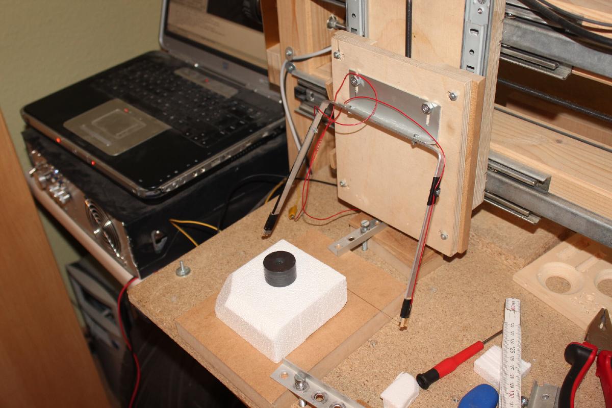 Eines Samstag Mittags packte mich die Langeweile und der Dremel war eh grad von der CNC abmontiert, also schnell ein Winkel an die Z-Achse und den Styroporschneider drangeschraubt.