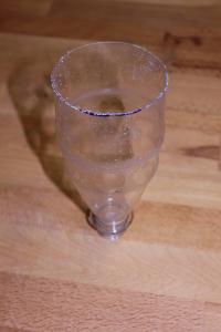 Nun wird die Flasche in den großen Deckel gesteckt und von unten mit dem Deckel fixiert. Von dem Deckel ist der obere Teil natürlich abgeschnitten.