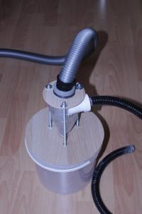 Damit der Staub auf seine Kreisbahn gebracht wird muss dieser Tangential in den Zylinder am oberen Teil der Flasche eingelassen werden. Dazu hab ich eine Plastikdose schräg mit einer leichten Rundung abgesägt und ein Loch in die Flasche gedremelt. Der Einlauf ist zuerst mit Klebeband und später mit Heissklebe fixiert. Ein Schlauch mit 20mm Durchmesser wird durch ein passendes Loch im Deckel gesteckt und kann somit seitlich an den Abscheider geschraubt werden.