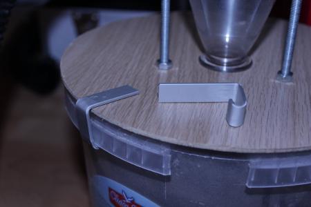 Damit der Deckel nicht dauernd vom Eimer runterfällt sollen drei gebogene Aluklemmen beide Teile zusammenhalten. Ein Gewicht im Eimer verhindert zusätzlich das Umfallen.