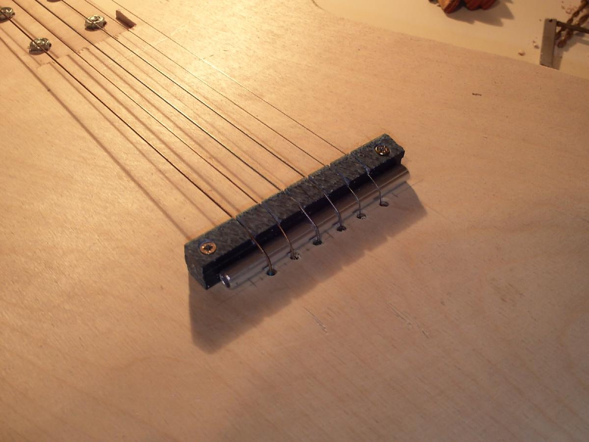 Hier der Steg. Hinterm Steg befindet sich noch ein Alurohr, damit die Saiten nicht den Steg zu sehr biegen.