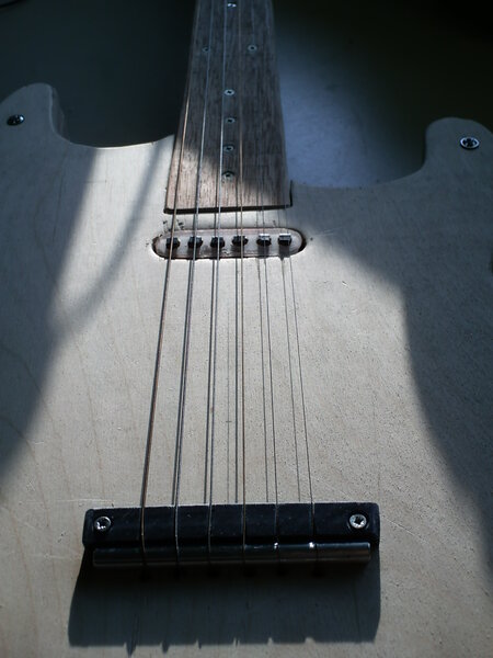 Dann hab ich noch alle Saiten aufgezogen. Dabei fiel mir dann auf, dass die Saiten viel zu weit vom Griffbrett entfernt sind.