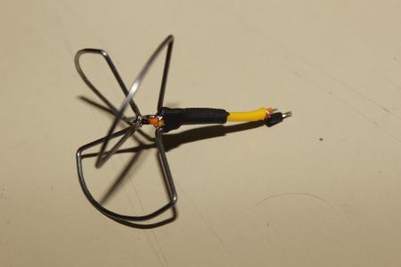 Dann fix eine Cloverleaf nach der eigenen Anleitung aus Stahldraht zusammengelötet. Das Coaxialkabel ist vergleichsweise sehr dünn, dafür aber leicht, gut biegsam und nicht ganz optimal für 5.8Ghz, was aber auf 1-2cm länge zu verkraften sein sollte.