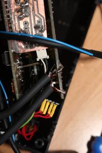 Den beiden Tastern hab ich noch je einen 100n Kondensator als Entprellung spendiert und einfach mit ans Kabel gelötet. An die 5-Polige Stiftleiste am Rand der Analogplatine werden vier LED’s angeschlossen, welche den momentan geschalteten Eingang anzeigen. Die LED’s dafür hab ich im Plastikgehäuse versenkt. Für die drei Status/Debug SMD LED’s auf der Unterseite der Digitalplatine sind drei kleine Löcher ins Gehäus gebohrt und mit Heißklebe abgedichtet.