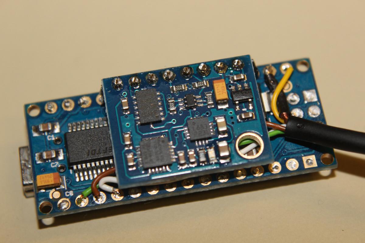 Wie in der Anleitung beschrieben kann die IMU einfach auf die Pins des Arduino Boards gelötet werden. Ich habe alle nicht verwendenen Pins der Stiftleisten ausgelötet. Vin, GND, PPM und den Center-Button-Pin hab ich über in ein 4 Poliges (mit Schirmung als Masse) Kabel gelötet. Am anderen Ende des Kabels befindet sich der Centerbutton, sowie ein 3 Poliger 3,5mm Klinkenstecker.