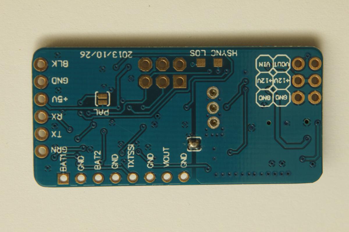 Da die 5V Lötbrücke auf der Oberseite und die Massebrücke auf der Unterseite bereits geschlossen waren, bekommt der MAX7456 seine Versorgungsspannug vom Multiwii (bzw dem FTDI Adapter).