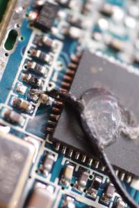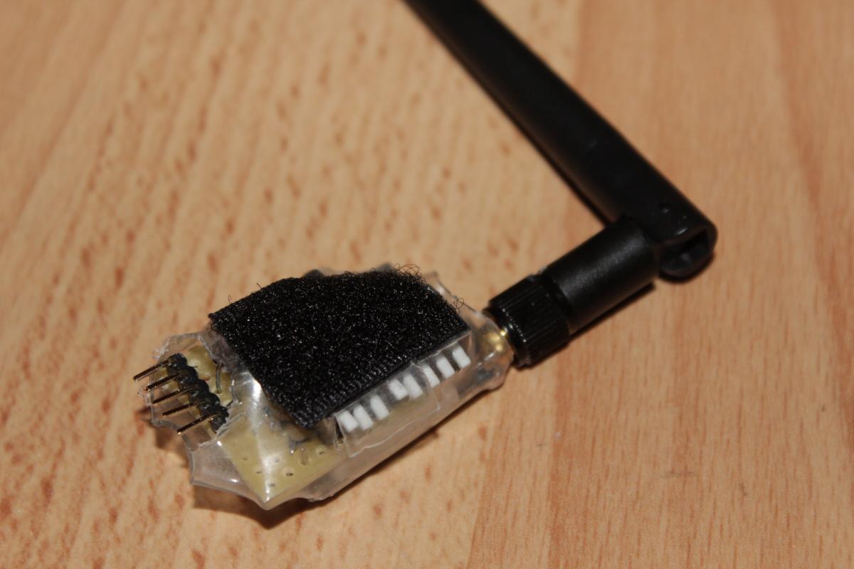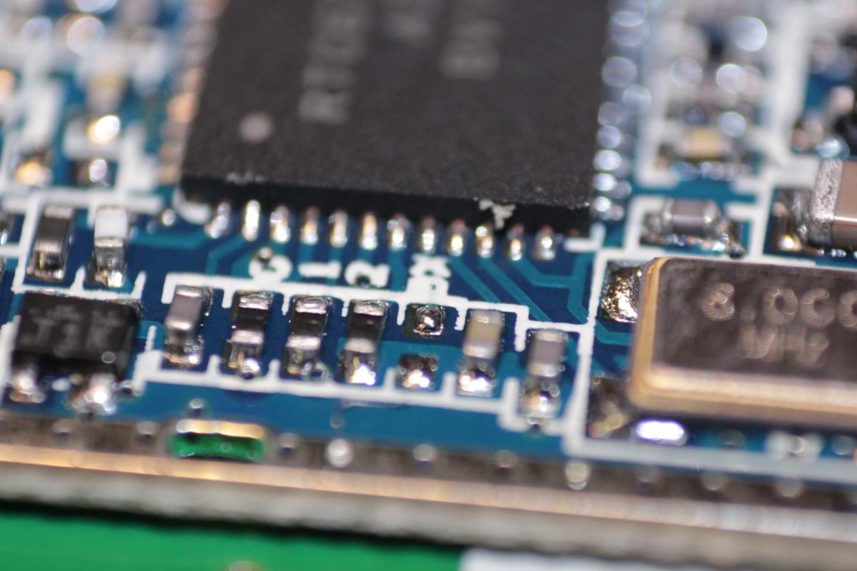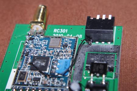 Der 200mW Sender war weniger schwierig. Kurz Pins durchzählen, Leitbahn nachverfolgen und kleinen Draht drüberlöten.