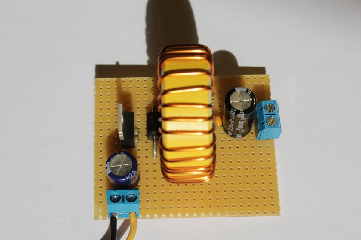 Da ich alles später mit 12V betreiben möchte habe ich einen LM2576 Schaltregler mit Grundbeschaltung auf eine Lochrasterplatine aufgelötet.