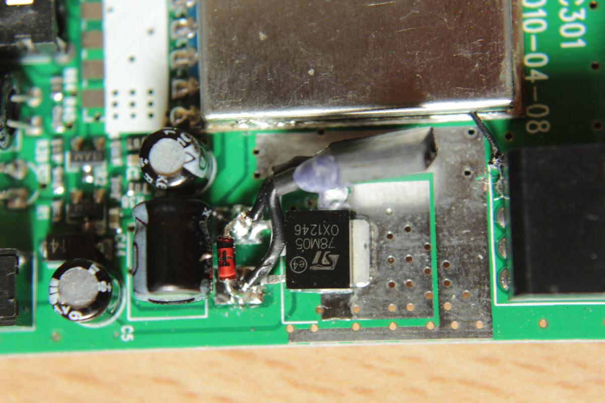 Da ich den IC nur brücken und nicht komplett auslöten wollte hab ich eine Schutzdiode und eine Buchste auf den Ein- und Ausgang des Linearreglers gelötet. Um den Receiver dann mit 5V zu betreiben brauche ich lediglich eine verbundene Stiftleiste in die Buchse zu stecken.