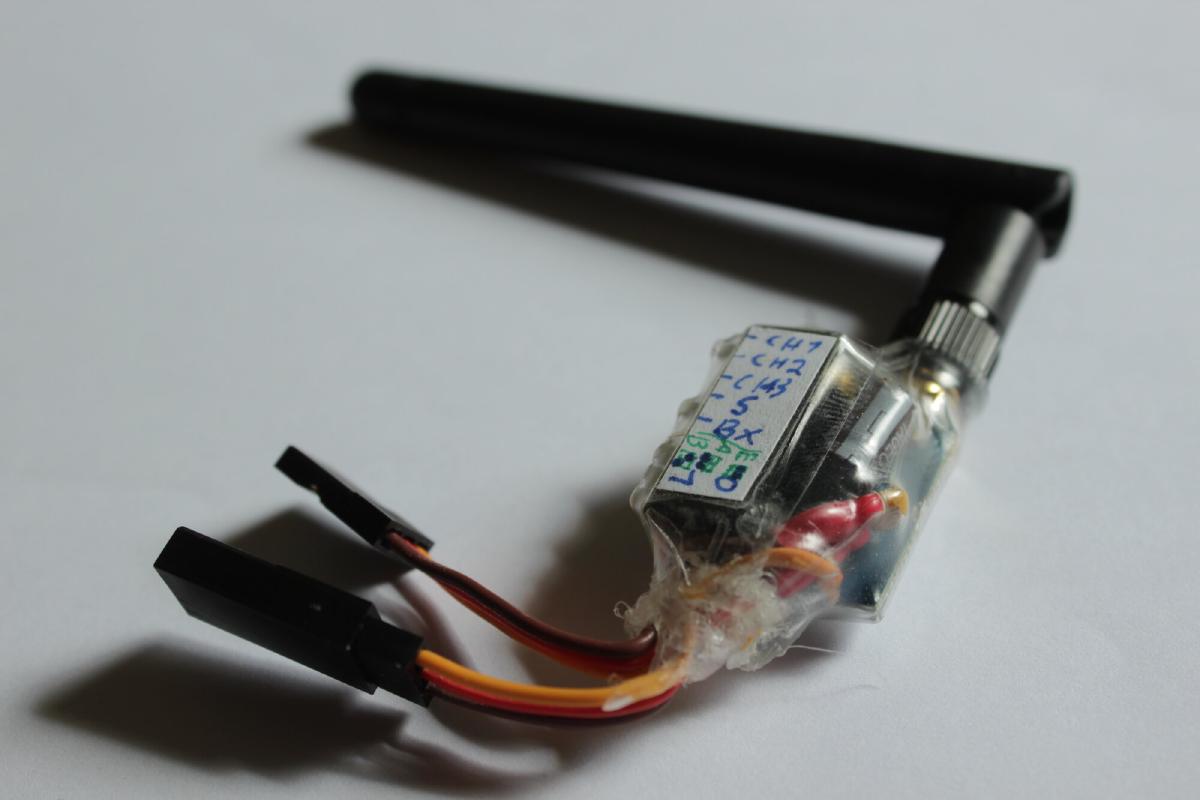 Nachdem das Metallblech wieder drauf war musste ich lediglich die beiden herausgeführten Kabel und die “Channelauswahlpins” Ch1,Ch2 und Ch3 an einen mindestens 5-Fach Dip Schalter löten. An die andere Seite der Dip-Schalterleiste kam dann noch Masse dran.
