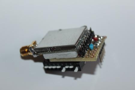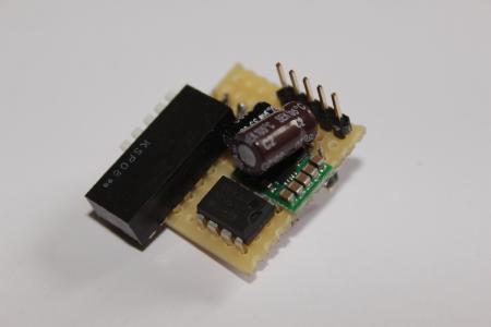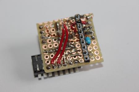 An die Stiftleiste wird dann zu guter Letzt das Modul angelötet. Die beiden Kabel für S und BX werden direkt an den Dip-Schalter gelötet. Das Modul hägt somit nur an einer Seite an der Stiftleiste, damit es nicht unnötig viel sich in der Weltgeschichte rumbiegt klemmt ein Stück Schraumstoff oder sowas zwischen Modulplatine und Lochrasterplatine.