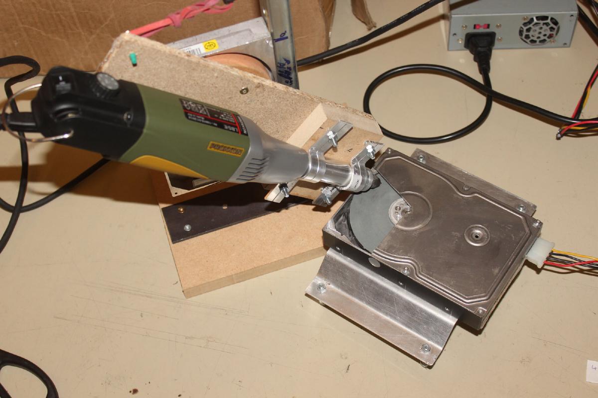 Beim Arbeiten mit den Plattentellern sollte man etwas vorsichtig sein, da es Festplatten gibt, bei denen die Platten aus metallbeschichteten Glas bestehen. Ob solche sich aber überhaupt zum draufrumschleifen eignen kann ich nicht bestätigen, ganz lustig ist es aber nicht wenn solch eine beim Schleifen nachgibt.