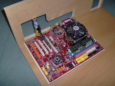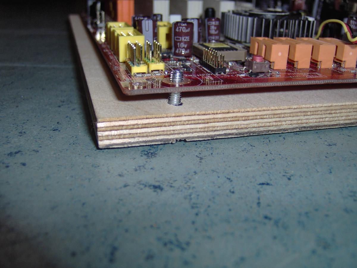 Den “Holz-Mainboardschlitten” am Holz festgeschraubt: