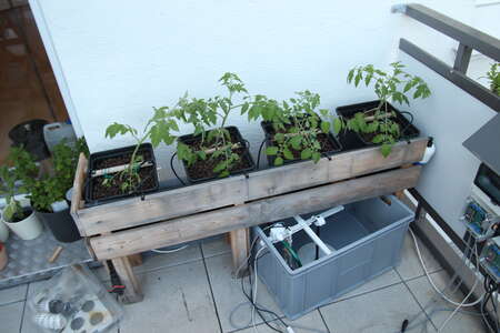 Entsprechend viel Wasser wird in dem Zeitraum benötigt. Das für vier Pflanzen doch recht kleine 30L Reservoir ist nach spätestens 3 Tagen leer und die Nährstoffkonzentration steigt mit dem schneller verbrauchten Wasser auch an. Als Lösung habe ich die größte Eurokiste die ich finden konnte als 200 L Reservoir unter das NFT Tischsystem gestellt. Von dort wird mit einer Pumpe und Magnetventilen das Dutch Bucket Reservoir bei Bedarf nachgefüllt. Auch das 60 L Fass vom NFT System und die Balkonpflanzen bekommen so automatisch ihr Wasser. Um das Reservoir aufzufüllen lege ich einen Gartenschlauch von der Badewanne durch die Wohnung in das Reservoir, um es aufzufüllen. Der Aufwand lohnt sich, wenn es nicht alle paar Tage sondern nur alle 2-4 Wochen passieren muss. So müssen Freunde oder Nachbarn nur noch zum Ernten kommen.. Und nachsehen, ob etwas kaputt gegangen ist *duck*.