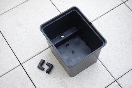 Das Prinzip hierbei ist, das sich unten ca. 5 cm hoch Flüssigkeit anstauen kann. Alles darüber fließt durch den Auslass ab. Durch die U-Form des Auslassstücks wird ein verstopfen durch Substrat oder Wurzeln minimiert.