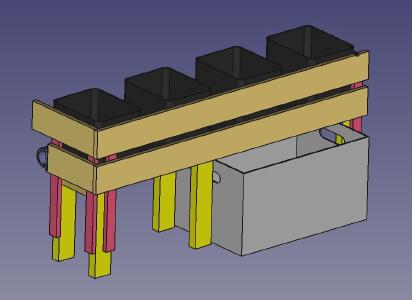 Auch beim Dutch Bucket System habe ich das Podest / Gestell in FreeCAD gezeichnet und aus Palettenholz gebaut. Zwischen Balkontür und Geländer sind an der Hauswand nur etwa 1,3m Platz. Damit die Tomaten nicht zu dicht aneinander Stehen konnte ich maximal vier Pflanzen dort unterbringen.