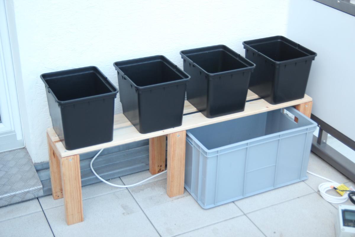 Entsprechend viel Wasser wird in dem Zeitraum benötigt. Das für vier Pflanzen doch recht kleine 30L Reservoir ist nach spätestens 3 Tagen leer und die Nährstoffkonzentration steigt mit dem schneller verbrauchten Wasser auch an. Als Lösung habe ich die größte Eurokiste die ich finden konnte als 200 L Reservoir unter das NFT Tischsystem gestellt. Von dort wird mit einer Pumpe und Magnetventilen das Dutch Bucket Reservoir bei Bedarf nachgefüllt. Auch das 60 L Fass vom NFT System und die Balkonpflanzen bekommen so automatisch ihr Wasser. Um das Reservoir aufzufüllen lege ich einen Gartenschlauch von der Badewanne durch die Wohnung in das Reservoir, um es aufzufüllen. Der Aufwand lohnt sich, wenn es nicht alle paar Tage sondern nur alle 2-4 Wochen passieren muss. So müssen Freunde oder Nachbarn nur noch zum Ernten kommen.. Und nachsehen, ob etwas kaputt gegangen ist.