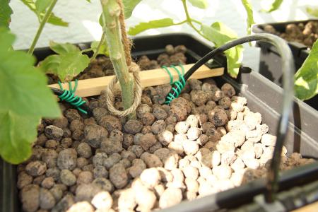 Die Tomatenpflanzen werden in Kokosfasern angezogen. Im Behälter selbst werden sie aber in Blähton gesetzt.