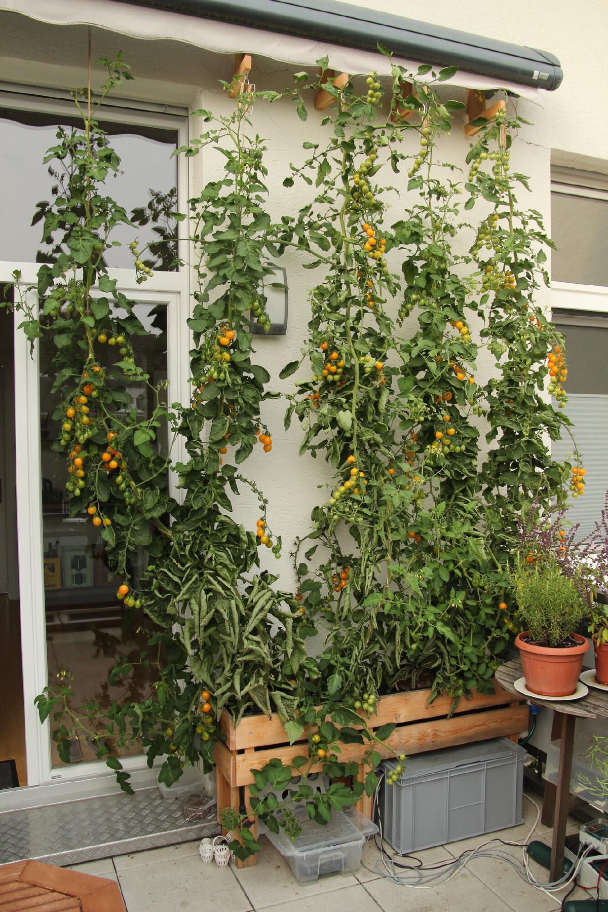Da sich oben kein weiterer Balkon als Dach befindet ist es empfehlenswert Tomaten an einer Hauswand vor Regen geschützt zu platzieren.