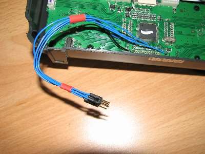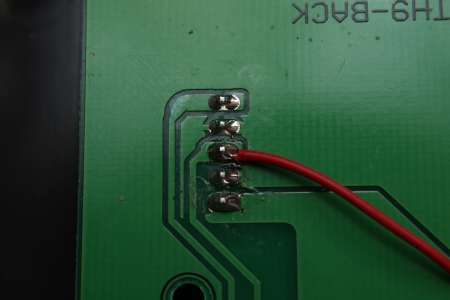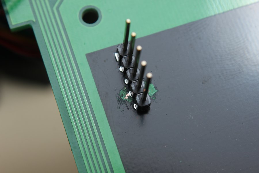 Die Leiterbahnen können also getrost mit einem Cuttermesser aufgetrennt werden, auf der Oberseite führen von dem zweiten Pin an den Seiten auch zwei Bahnen richtung Massefläche, die ebenfalls durchtrennt werden müssen. Nachdem die beiden keine Verbindung mehr aufweisen wird an dem untersten das rote Kabel angelötet, an dem zweiten von oben das Schwarze mit einem 470 Ohm Widerstand dazwischen.