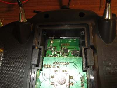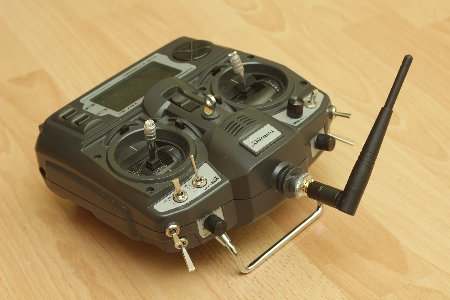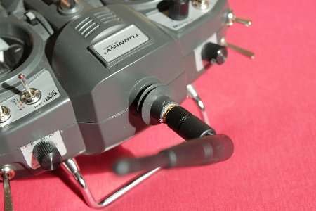 Von der Turnigy 9x (oder wie sie sonst noch heißt) gibt es verschiedene Ausführungen. Bei meiner war die Antenne fest am Gehäuse angebracht und über ein dünnes Koaxialkabel mit dem Sendemodul auf der Rückseite verbunden.